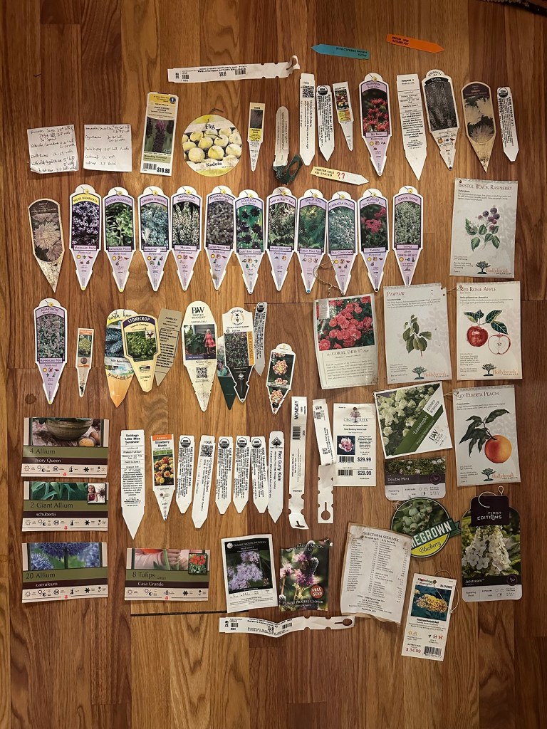 I was getting ready for a party recently when I decided it would be a good idea to clean out a random cabinet in the kitchen. I found these old plant tags from the early years of gardening our current house and couldn’t throw them away without snapping a picture. Some of these plants are still thriving, some have spread themselves around the garden, and many have died.