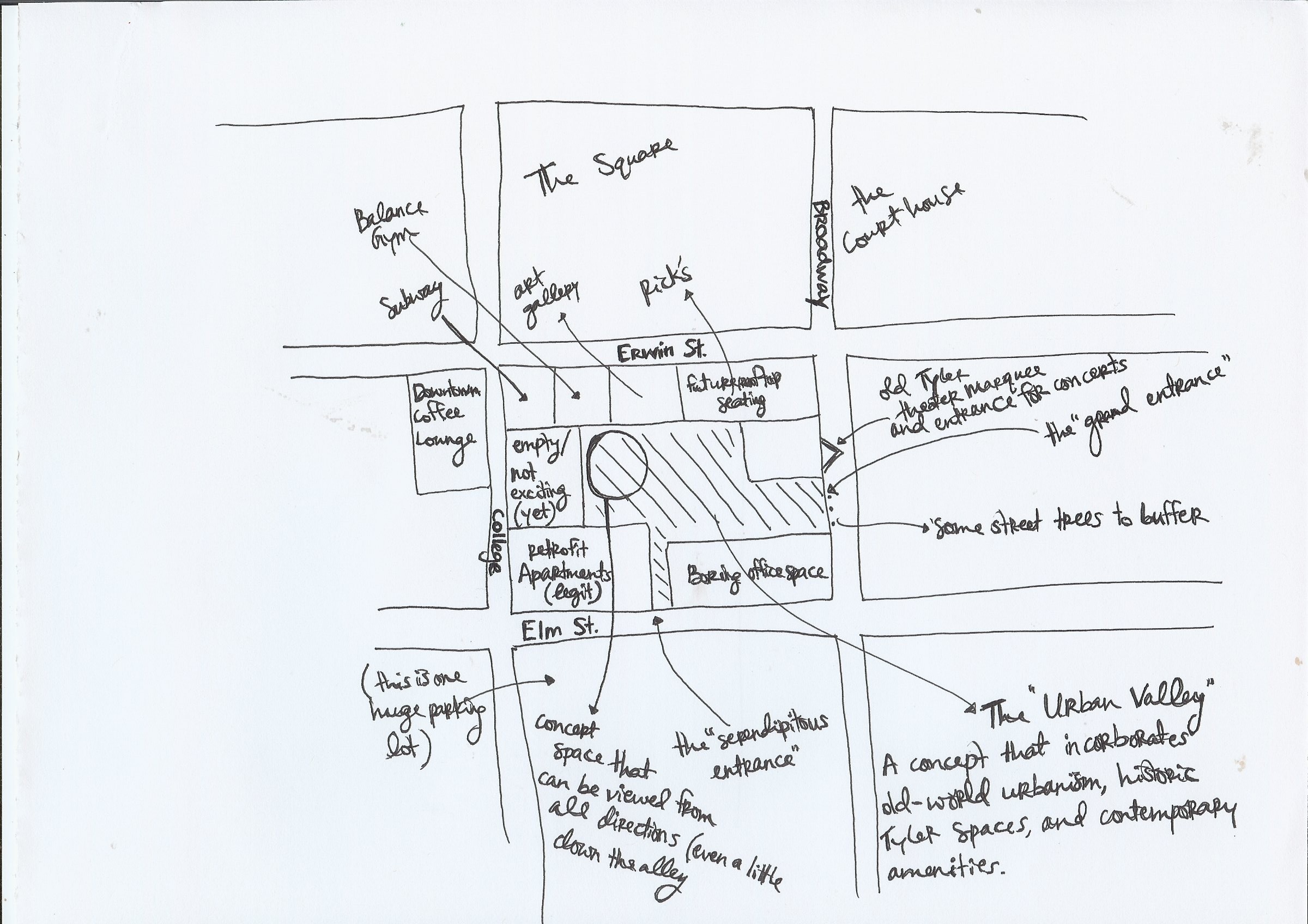 “The Valley” is my name for this concept (pictured) I’ve been dreaming about for over five years. One day while I was walking through downtown Tyler I saw this parking lot (check it out on Google maps here) and realized: This is one of my favorite spaces in Tyler. From Broadway, you can see that this space is sort of a large pocket within the Tyler downtown grid. This pocket is surrounded by buildings on all sides except for this large entrance on broadway and a smaller “serendipitous entrance” on Elm.