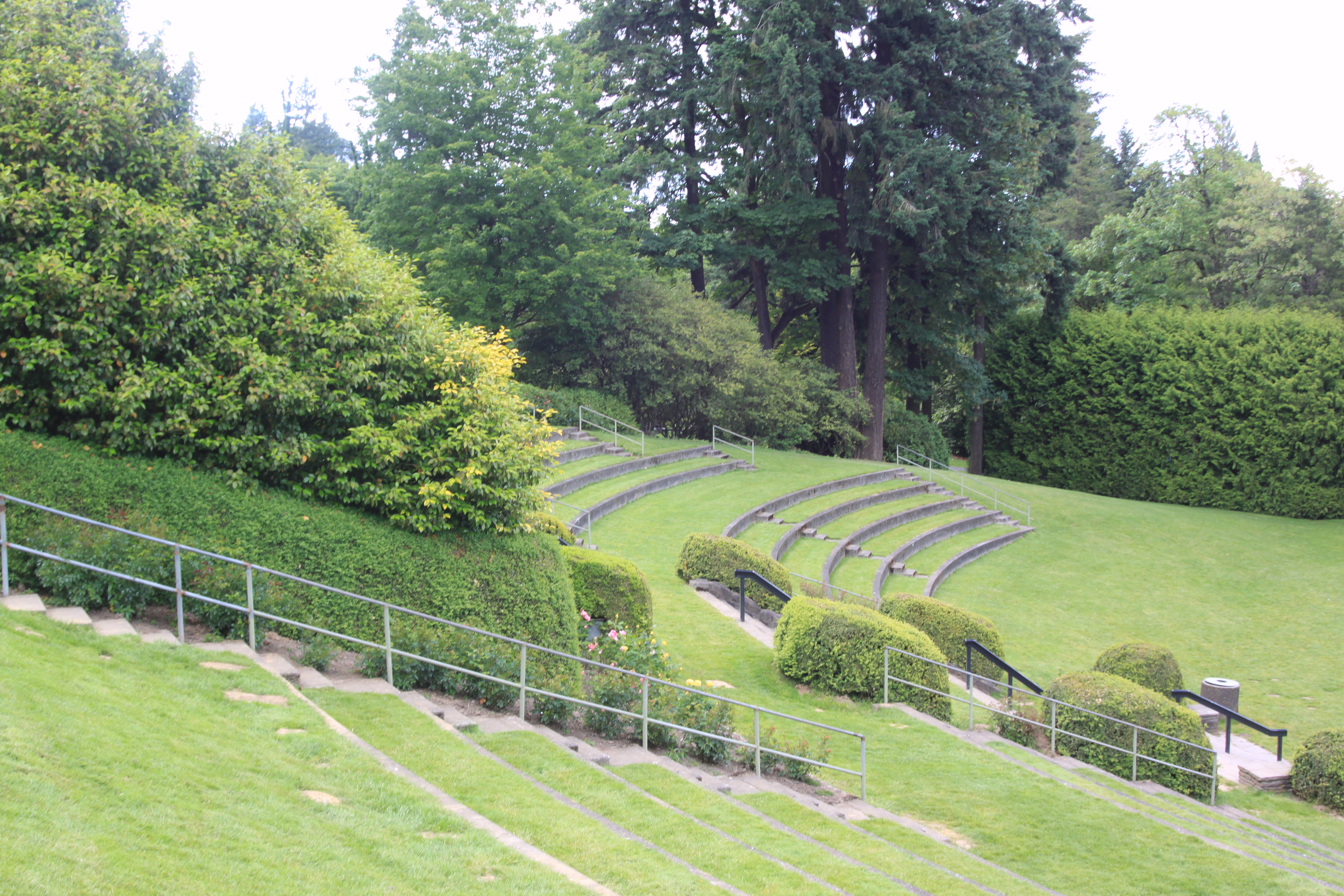 “Live at the Rose Garden” is the hottest tagline in East Texas because (you guessed it) the backdrop to the concert is the largest municipal rose garden in the nation and for once there is something to do while you’re looking at it. This amphitheater looks like the one from the Portland Rose Garden (to the right), but it’s better because it’s facing the flowers instead of big bushes. Every Friday night during the summer there’s a live concert here and people come from all over to fall in love with the place (and return again). When they arrive, they exit the street car at the stop just outside Harvey Hall on Front St. If they’re driving, they’re directed to park in one of the parking garages (PG) or lots (P) located on the perimeter of the complex. The roads within the complex also have on-street parking and handicapped spots closer to the center of the site. They all meet at the new roundabout in the middle.