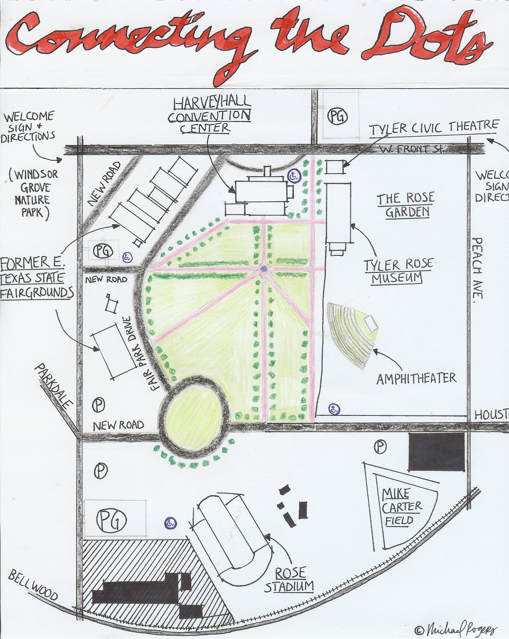 Fortunately for Tyler, a blank slate is a great place to start. My mind has wandered for hours these past few days and it finally arrived at the place pictured to the right. It looks like the Tyler Rose Garden Complex, but the center of the picture is grass (light green), trees (dark green dots), and rose bushes (dark green squiggly lines). And a water feature! (blue dot where the paths converge). In this place, the view from Harvey Hall is grand: Down a path bordered by trees, across a great lawn and toward the old fairgrounds and the Rose Garden. There is nothing but trees and grass between Harvy and the Rose Garden so that people can walk from one to another in the cool shade of trees. The Rose Garden itself hasn’t changed much except for the addition of an amphitheater (!) for live converts. (Big shout out to fellow visionary Tom Ramey and others for the idea of making the Rose Garden a music venue).