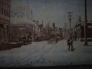 The second example of a nostalgic mural (left) is a little more complex. It is titled a “Main Street” mural in Ilwaco, WA located on, not Main St., but Spruce St. at the intersection of First Ave. This mural depicts the same nostalgia for a bustling past with cars! trains! A/C grid! and a man with a hat! walking through the street. This is clearly a mural of past progress and innovation.
