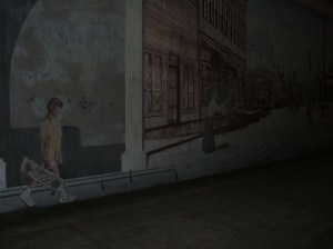 When I looked closer, however, I realized that it’s actually a mural of a mural of progress. On the left side of the mural, there’s a boy walking with a skateboard toward the mural of the old Main St. The boy seems to represent a newer sort of progress, but is placed in context of the historical legacy of the city.