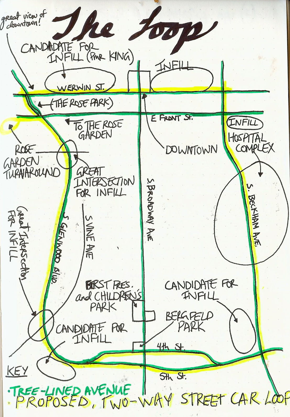 *I also had a policy thought: Developments and businesses along The Loop would be exempt from zoning laws that require on-site parking. Instead, public parking would be provided at points along The Loop to encourage a “park-and-ride” system.