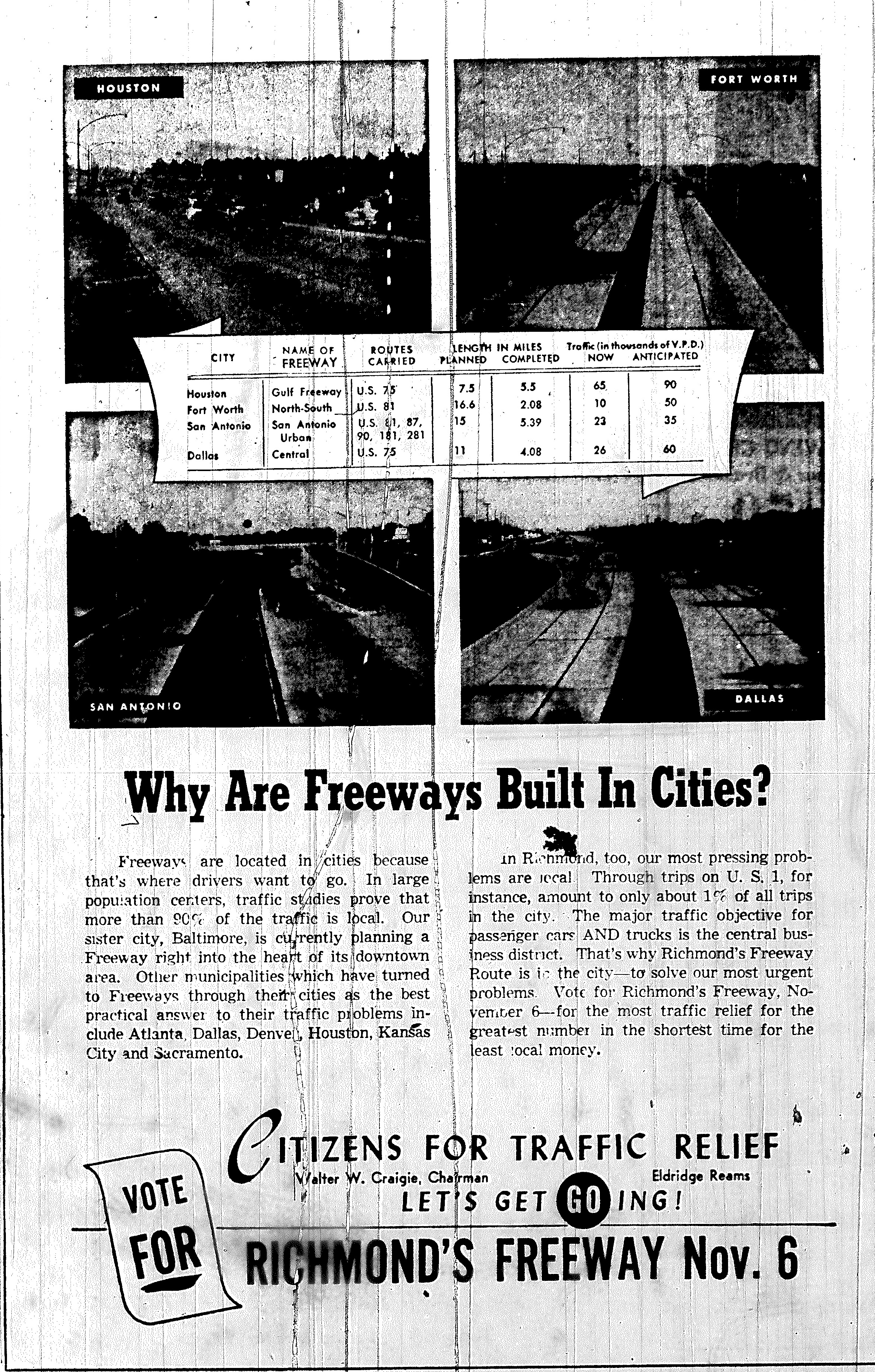 On Nov. 2, 1951, Citizens for Traffic Relief ran a political ad in the Richmond Times-Dispatch titled “Why Are Freeways Built in Cities?” This ad was purchased in anticipation of the second public referendum related to the Richmond-Petersburg Turnpike (which failed). It reads,