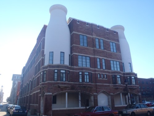 Since I’ve received so much feedback for an early post on the Kickers buildings in East Texas, I wanted to add a new post on a building in Richmond that attempts to “be” what it is (a “duck” a la Venturi). The old Richmond Dairy Company building on Jefferson and Marshall has intrigued me since the first day I saw it. An gothic-style brick building, there are three corners that were built out, rounded and shaped like giant milk bottles. The best thing about this building design? Don’t need a sign.