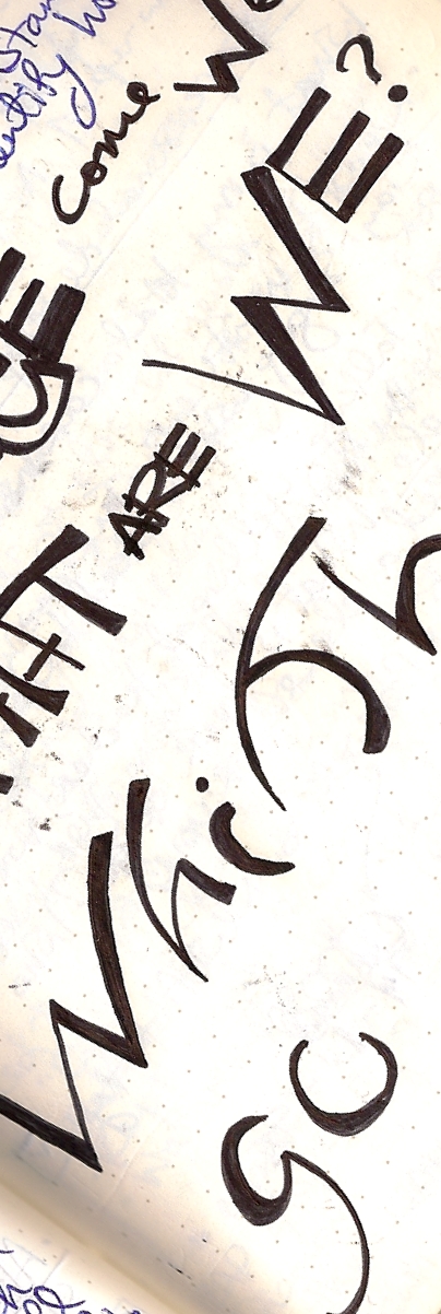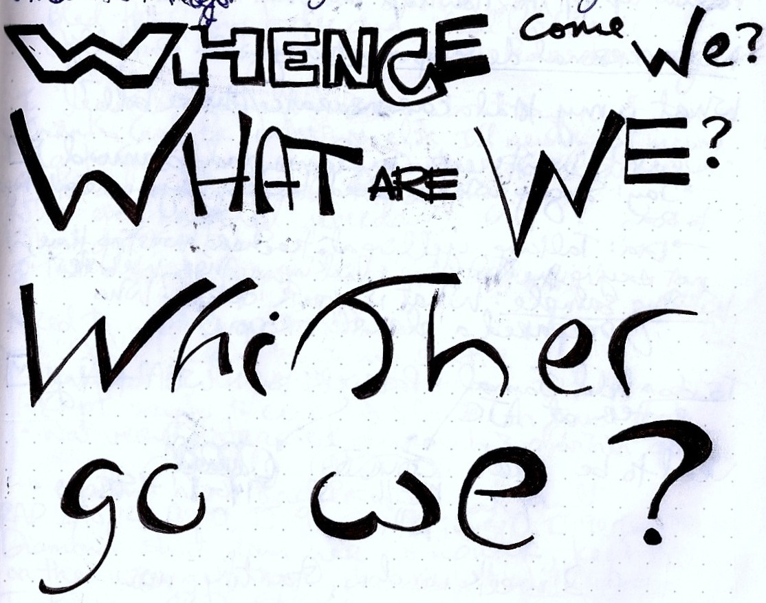 Last Saturday I was thinking about Paul Gauguin’s painting “Whence come we? What are we? Whither go we?” So as I thought about the questions, I wrote them out in some random fonts and scanned the page. I got one good scan, but I think I prefer the image below where the scanner randomly cropped it: