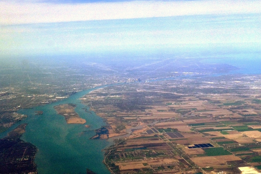 As I descended into Detroit, I realized I’d lucked out with my window seat. As we flew west, I looked north to this view of the city of Detroit and nearby Windsor: