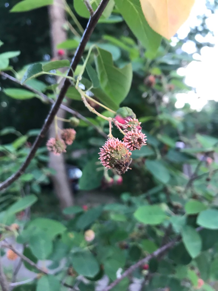 Two months ago I was feeling hopeful and sentimental about spring and excited about the potential of the buds on my serviceberry. This week, I discovered that the supposed abundance of berries I was hoping to eat in June are now disgusting and inedible. The plant apparently has something called Cedar Apple Rust. Now the berries that were flowers that were buds full of potential are just hosts for a fungus preparing to spread.