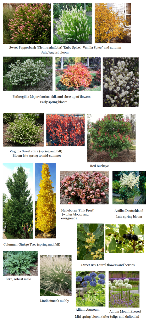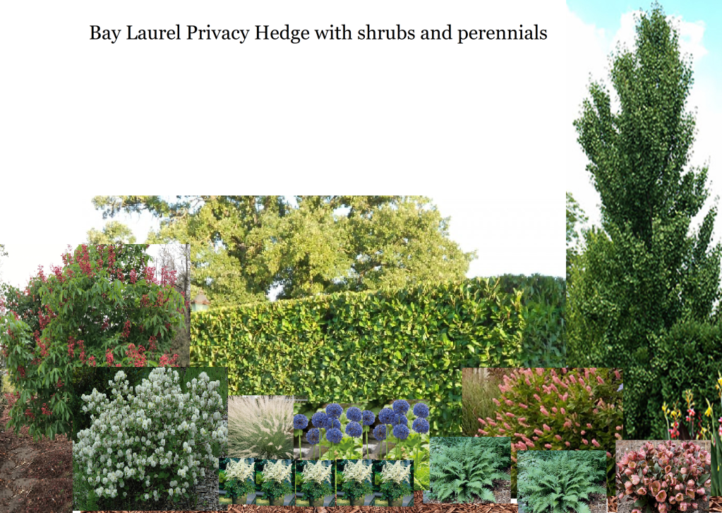 Just sharing something I put together for a friend that wants to block the view of a neighbor’s house from their back patio. It’s not totally correct with spacing and siting, but could be tweaked pretty easily. I chose Bay Laurel because it’s evergreen and the leaves can be used in the kitchen (bay leaves) and the shrubs and perennials provide a nearly year round color mix, attraction to pollinators and birds, and are low maintenance once established. If I were to actually install this I would follow the instructions in this “How To Create A Privacy Hedge” video by Urban Farmstead.