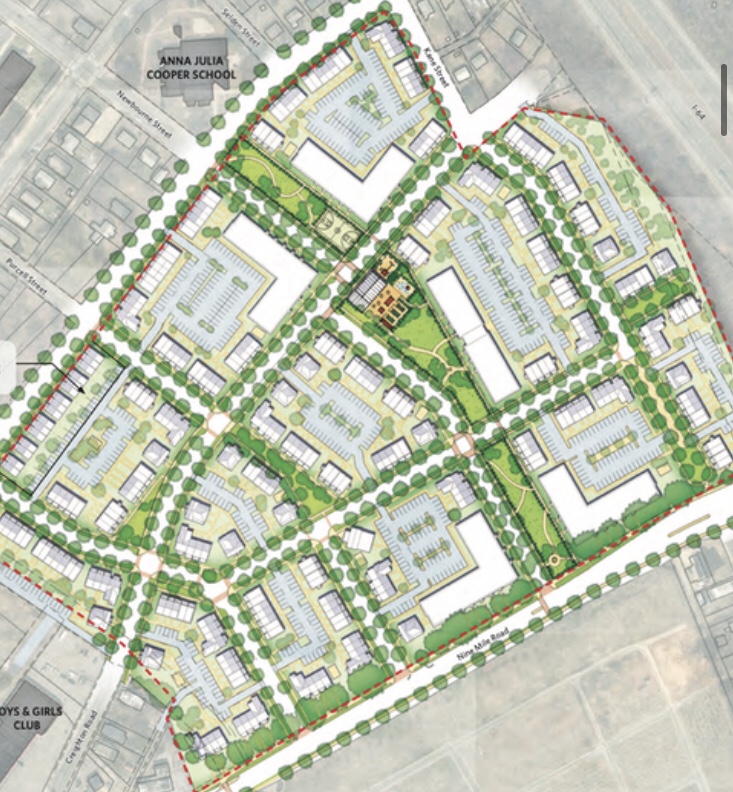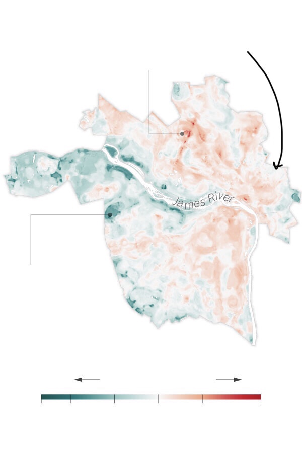So we come to Creighton Court and all the public housing communities in Richmond. If you look closely at the map on heat disparity in Richmond, these public housing communities (see arrow below) are not nearly as hot as Gilpin Court, the neighborhood most talked about, or even expensive neighborhoods like the Fan. My neighborhood elsewhere looks about the same shade of green as Creighton.
