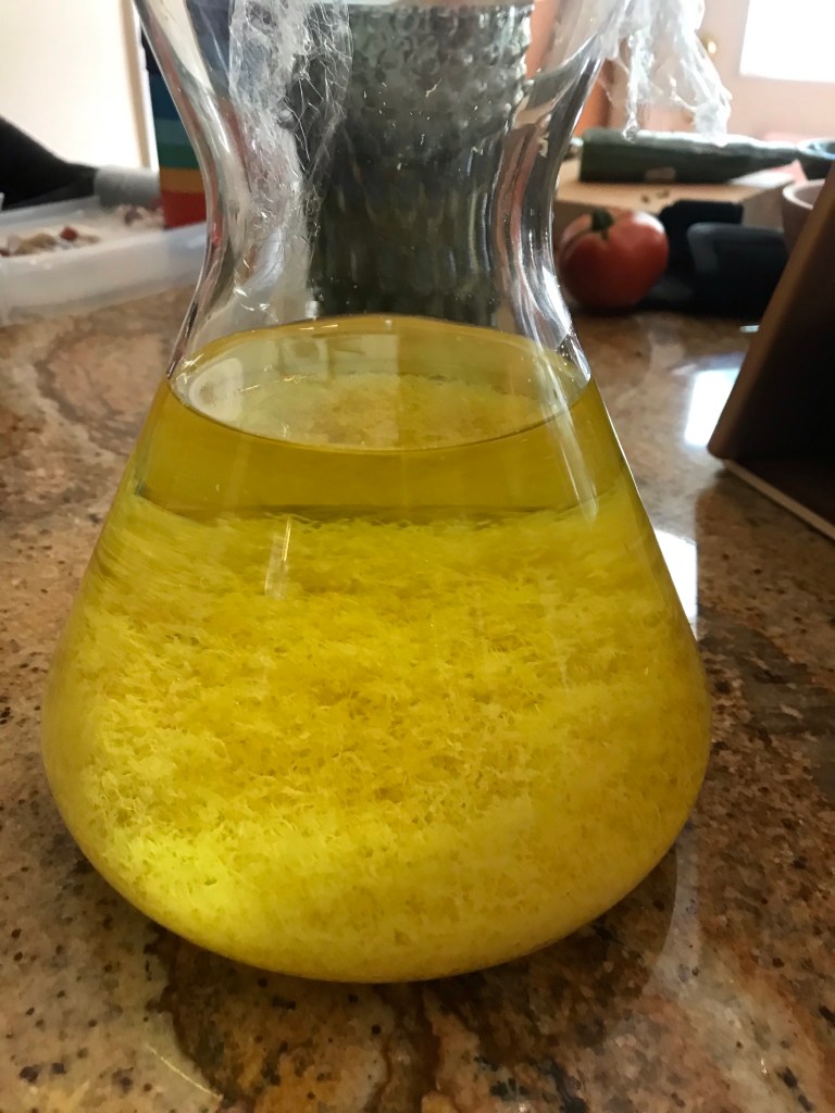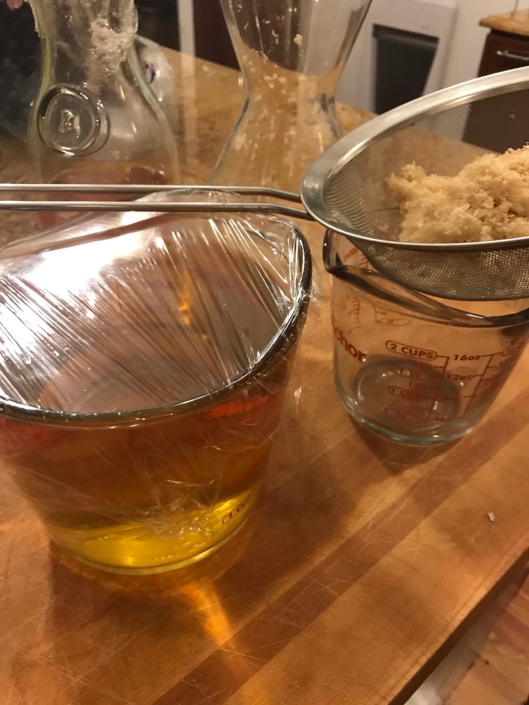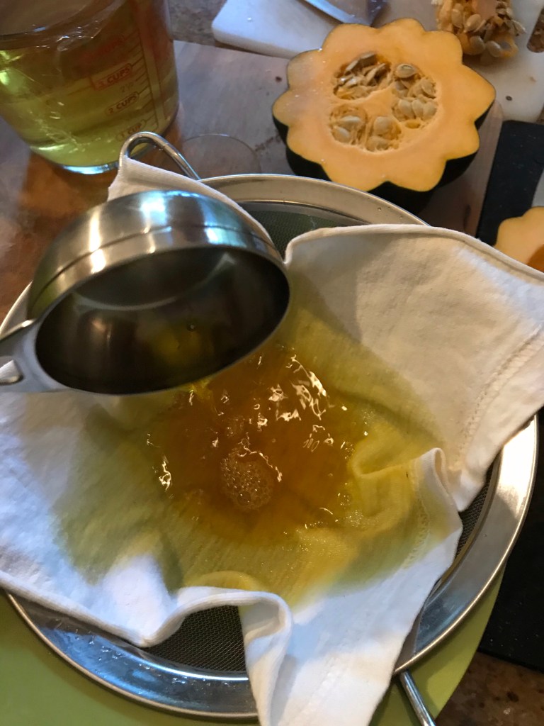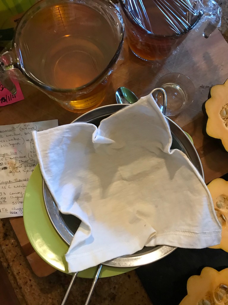 To avoid any sediment (a mistake I’ve made before) do another filter through a t-shirt placed on the sieve. In a former job, I wore undershirts every day. Now, I never wear them so I have a pile to use for stuff like this. They are washed I promise 🙂