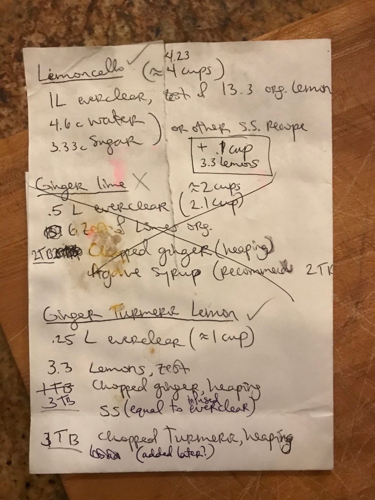 I’ve made limoncello three times that I can remember. The first time was with my mom when I was on break in college. We had gone to Italy for a week and tried some for the first time at a restaurant then a homemade batch at a friend’s house in Milan. That sounds a little more glamorous than it was, but it was very fun and memorable. My recipe is based on whatever I found online, but I’ve also tried variations. I wrote them down on a piece of paper with field notes so it looks authentic. I make traditional limoncello and a ginger, turmeric limoncello that packs a punch.