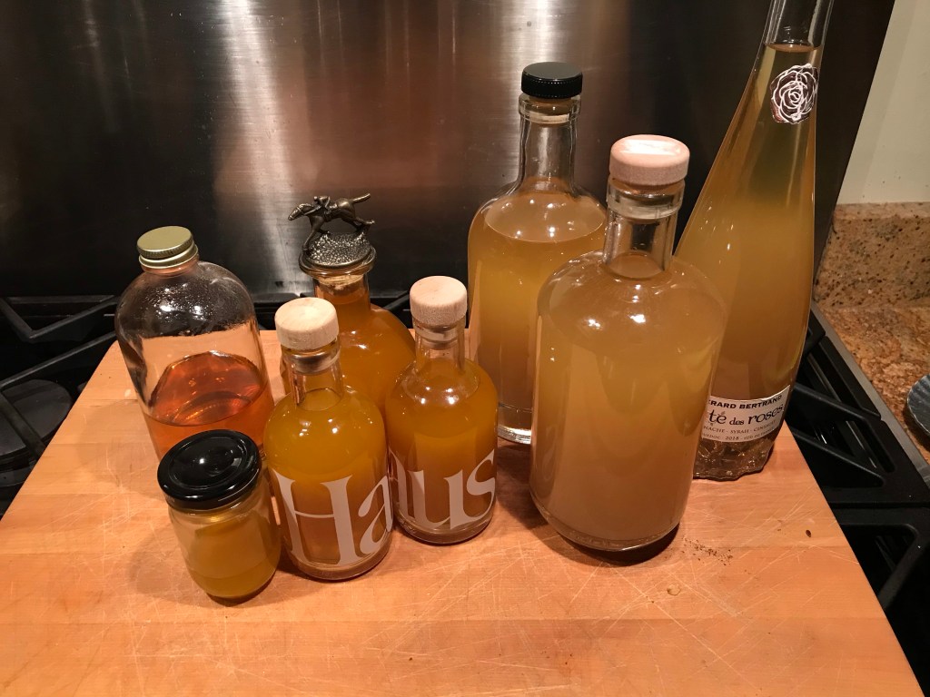 From left to right, leftover simple syrup, four small bottles of the ginger turmeric limoncello and three large bottles of the traditional limoncello. The one on the far right is a belated birthday present for my mother-in-law by special request.