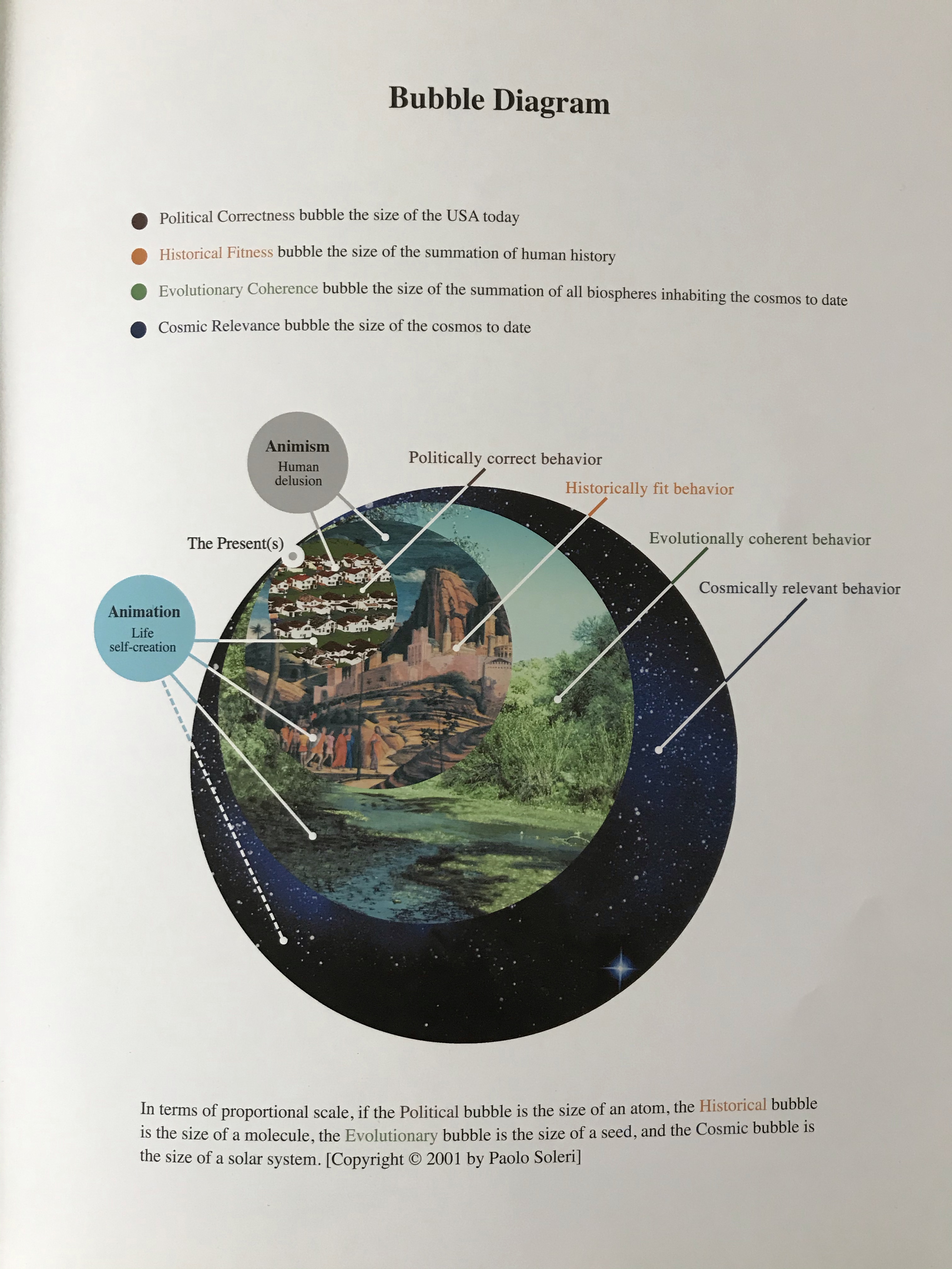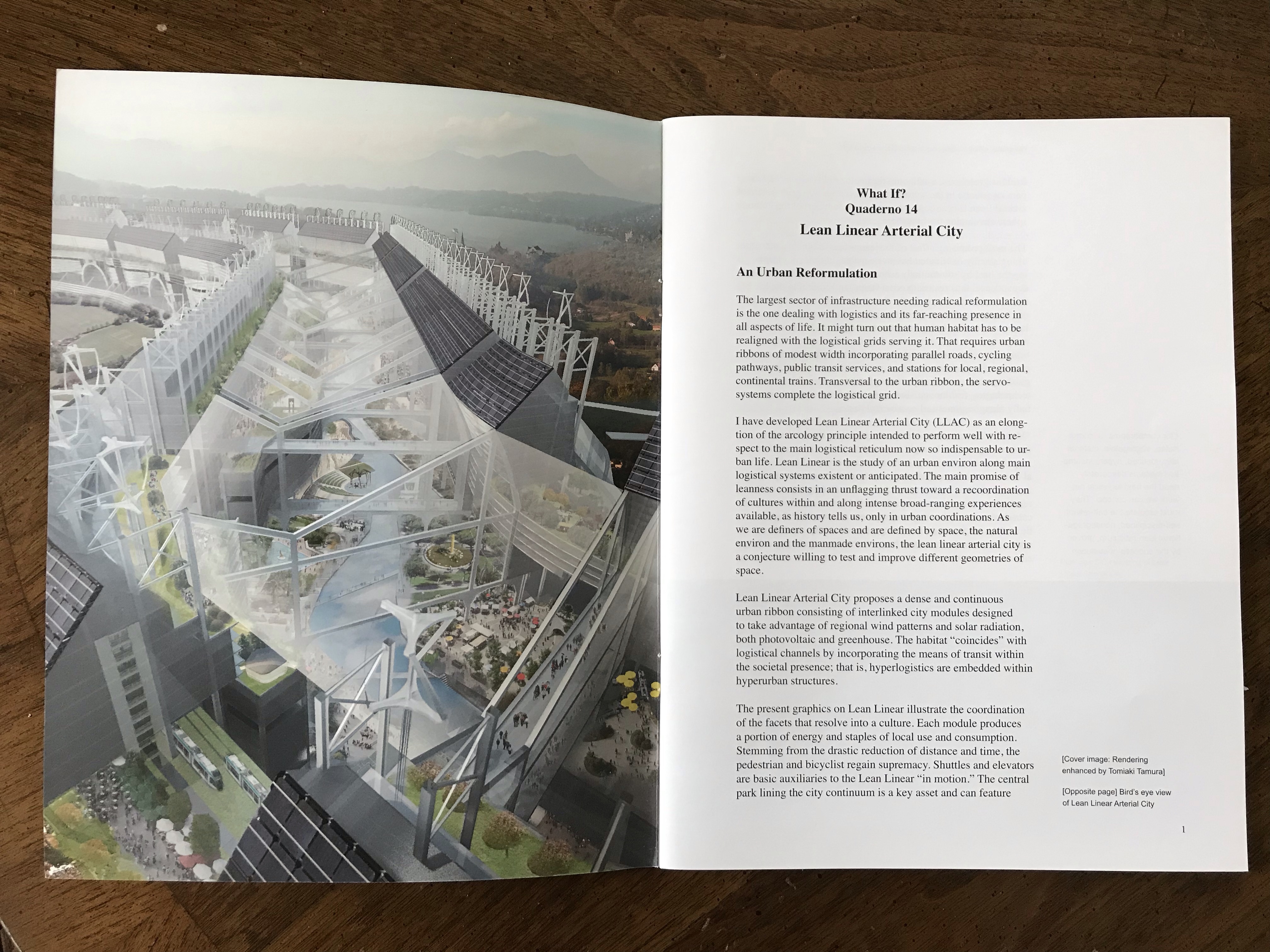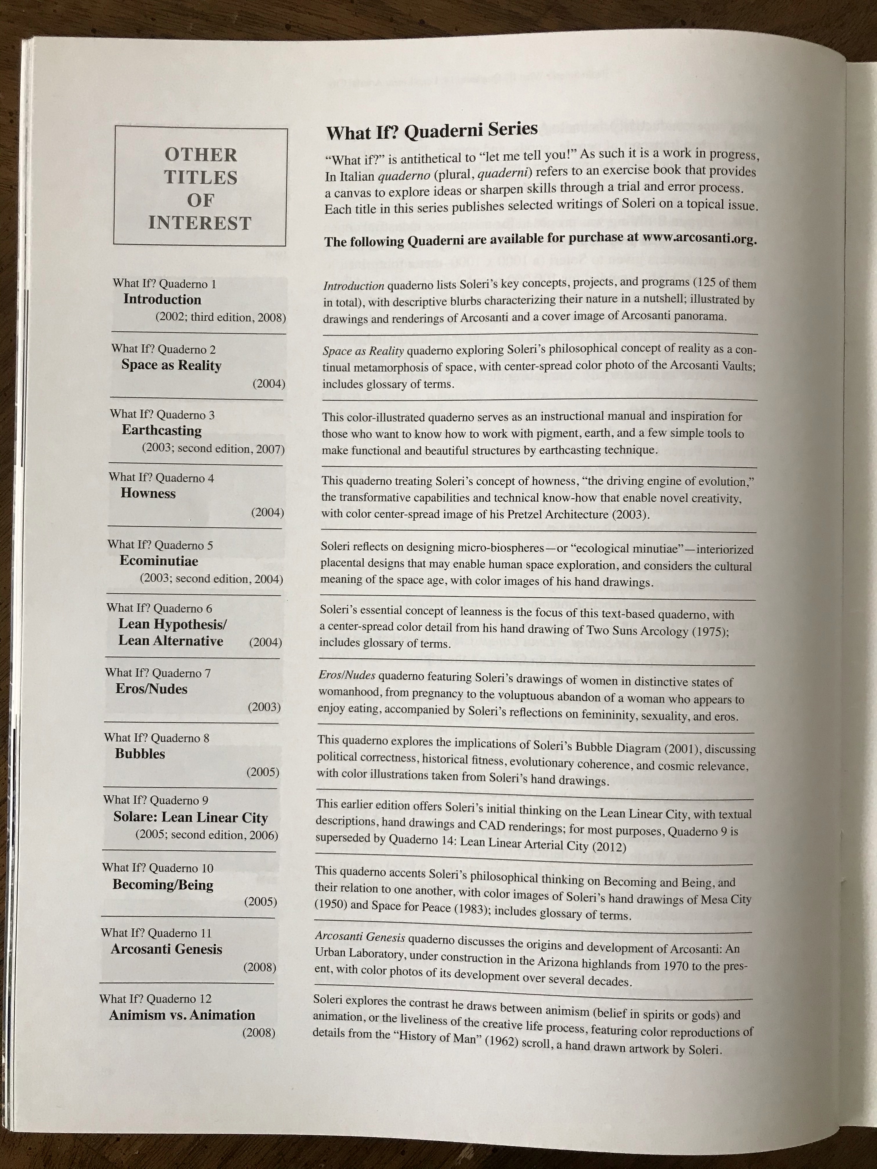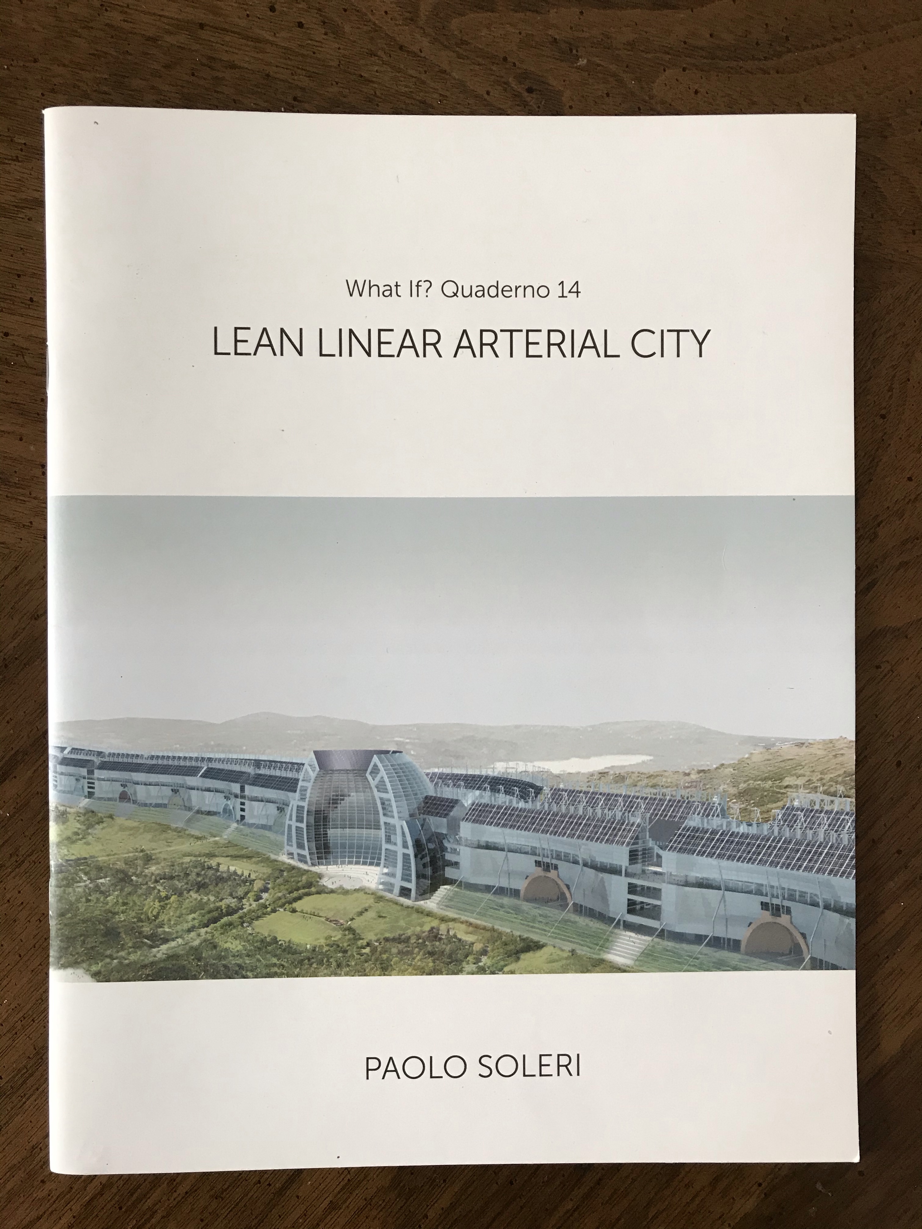 I bought one of the recent editions of his Quaderno series titled Lean Linear Arterial City. I’ve added some photos below. When I bought the book, the guys behind the counter joked that the place was started by some Italian guy who planted friendship trees everywhere to make it look like Tuscany, but they have to be watered every day because they aren’t native to the desert. I think that’s a good analogy for most of Soleri’s ideas and maybe Soleri himself. He had the vision, but it would require daily work by other people to make the dreams a reality. He was also unrealistic and in the context of reality some of his dreams seem to contradict.