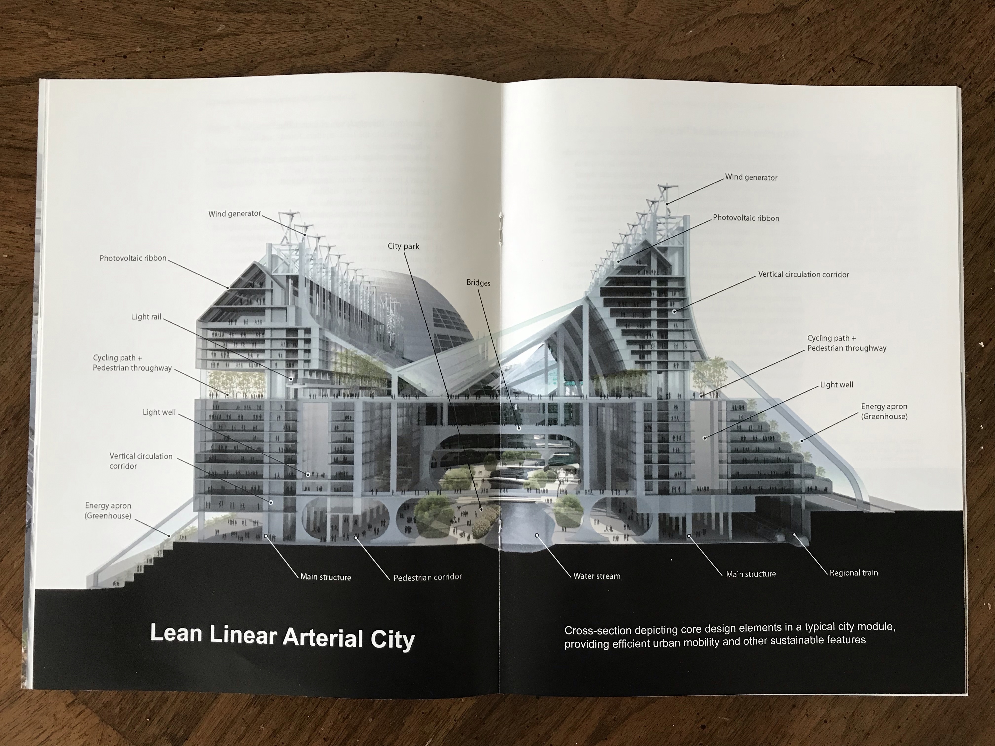 I love the drawings and the ideas in Lean Linear Arterial City. I love the idea that cities in flood-prone areas could be built on ridges in order to protect inhabitants as well as the areas inland. I also really appreciate the idea of a city that is self-sustaining, energy-producing, efficient, and beautiful. My main critique of this particular idea is that in order for cities to really be resilient I think they need to be more modular. When one structure in a traditional city gets too old for repair, it can be replaced. But if the entire city, miles of steel and concrete, reaches obsolescence, it would disrupt an entire society. I might compare this to The Loop at Apple Headquarters, a building that many have said cannot be split up or retrofitted for many purposes after its current use. For the city below to be constructed and inhabited, there would also need to be a mass relocation of people and abandoning of existing cities. That feels like a waste compared to retrofitting existing cities. But it’s true that eventually we may need to give up on some of our cities. At that point, we will have wished we had started construction on this lean linear city decades earlier.