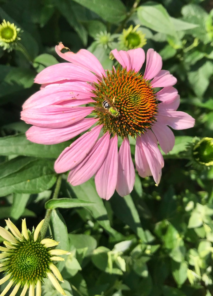 June 15 – In the next two photos, a metallic green sweat bee and a bumblebee forage on the earliest Echinacea blooms of the season. The sweat bees are especially beautiful to watch in the sun.