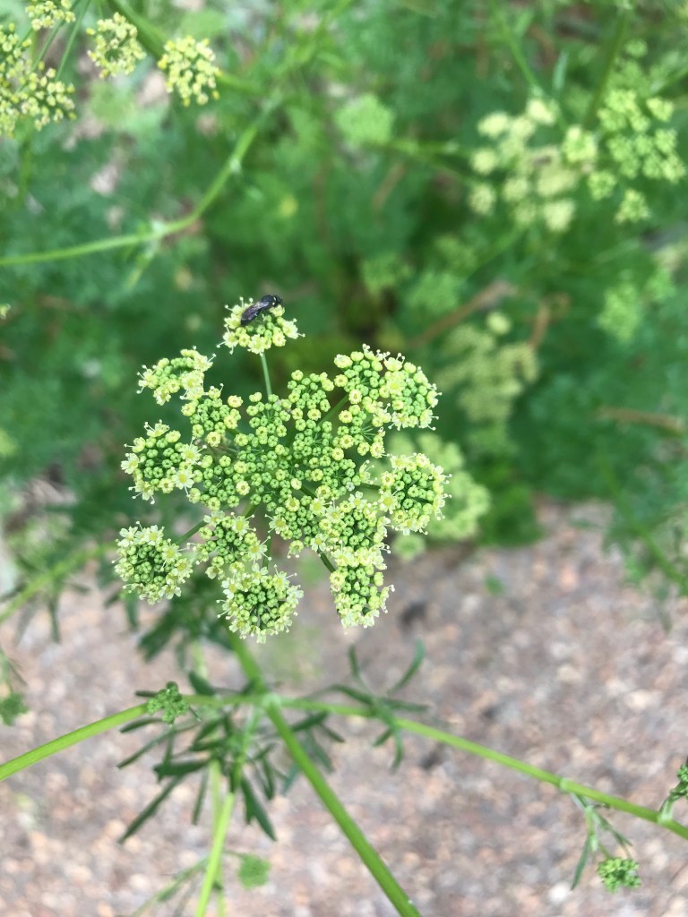 June 11 – I let some parsley flower this spring. It’s the first time I’ve seen a parsley flower before and it was interesting to notice which insects were attracted by it. I’m hoping it goes to seed and brings back a whole flower bed of parsley next year. Below is a cool, black and blue false wasp.