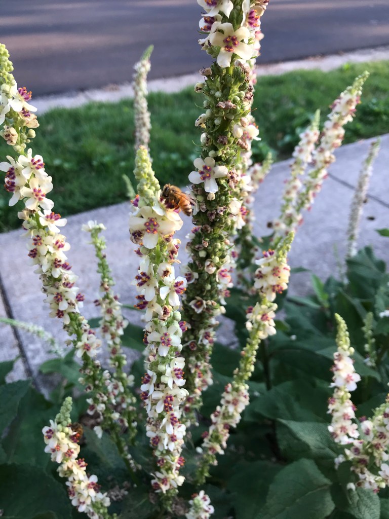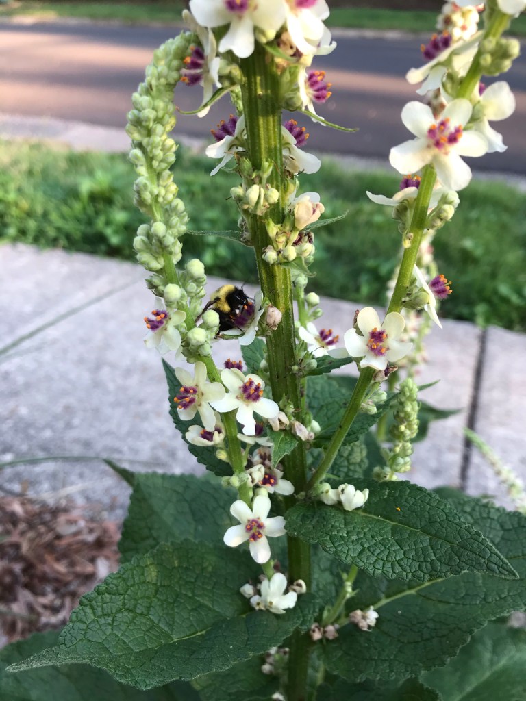 June 1 – The earliest major pollinator show of spring around here is watching honey bees and bumblebees swarm a pair of Verbascum chaixii ‘Wedding Candles’ (aka Mullein). I first noticed this burst of activity last year and was very much looking forward to it this spring.