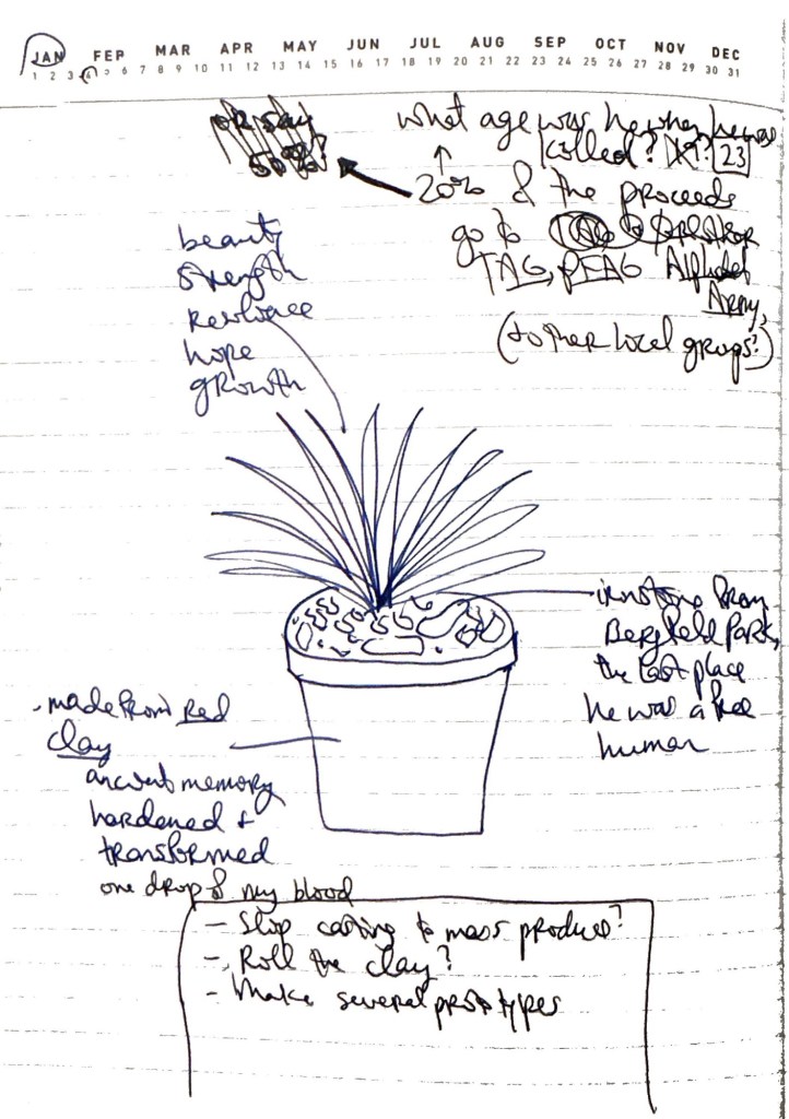 4.22.25 – Since writing this post I’ve thought more about the possibility of partnering with an artist to make the pots that I could use to plant and we could market the project together. Even still I don’t think I have the time to do it well, but the partnership would be really rewarding and it’s much more realistic to lean on someone’s existing expertise rather than try and develop it myself. It also got me thinking outside the box even more. Maybe this idea should actually be an assignment for a class where everyone chooses an event that deserves more recognition and designs an installation to share the story. Maybe it should just be an online project that collects memories and details from his story. Or maybe this just needs to be a section of my own garden: a shrine to his life and a broader connection to my own story, my hometown, and the resilience, growth, and occasional moments of flourish.