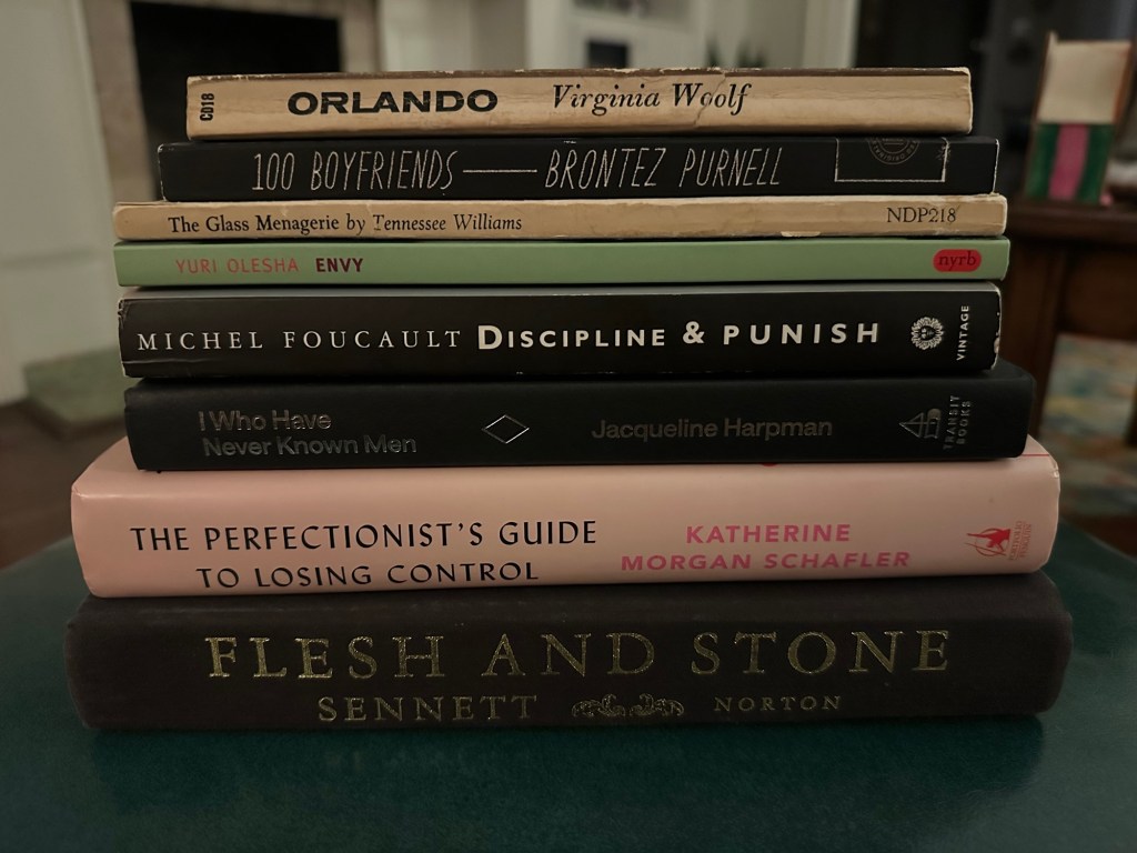 I started the Foucault and Sennett books around 2008 and 2011, respectively. I’ve only read the first chapter or so of each, but they have both been so influential to how I think about things that I’ve decided I’d like to finally finish them. Along with those two books, Orlando, 100 Boyfriends, and The Glass Menagerie continue to round out my gay literature cannon. I Who Have Never Known Men and Envy (a personal problem, unfortunately) are two foreign language books I’m looking forward to. Finally, The Perfectionist’s Guide to Losing Control, a book I started during a hard time last year and have decided to pick back up during a new season of loss.