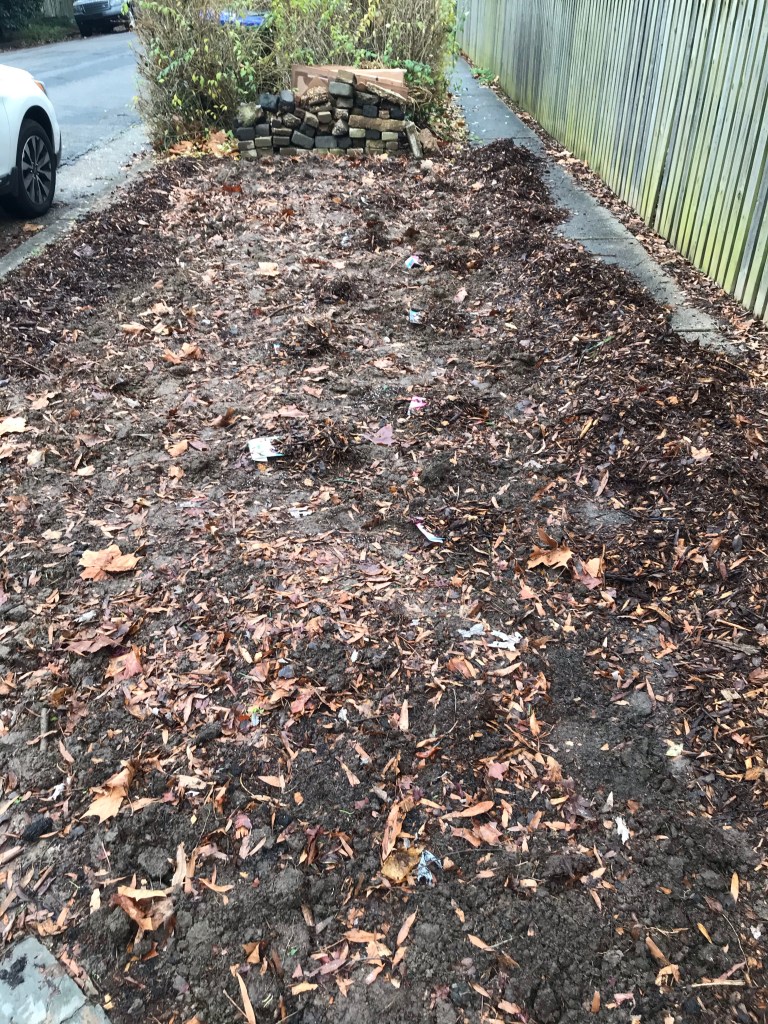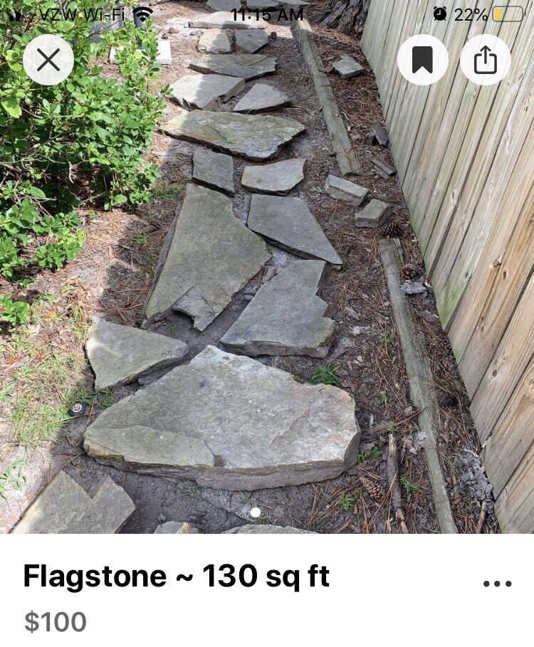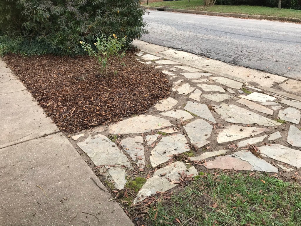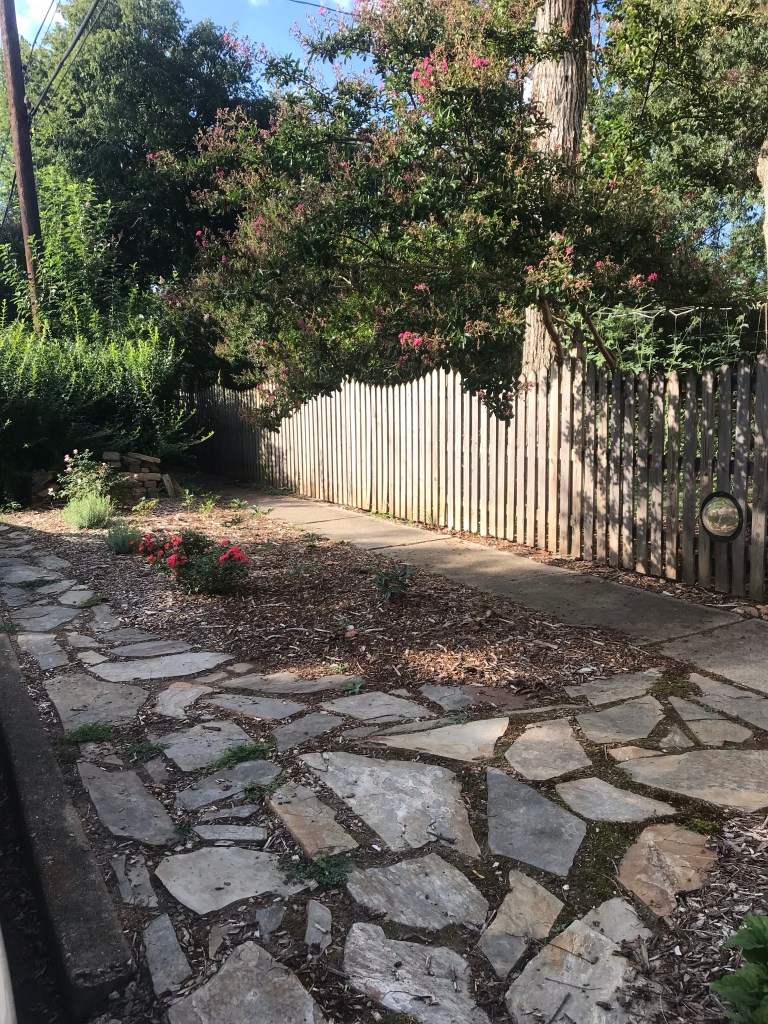 In July, I got some help to dig out the first iteration and see how it felt. The path went from the street to the sidewalk, but I realized it would only work for the one car parked near the path. The stone in version 1.0 was just old concrete and pavers I’d found around the yard and these are still piled up in a stack at the end of the flower bed, waiting for me to have the energy and inspiration to do something with them. At this point, it was actually more dangerous to walk on because nothing was set. Then, I saw this post on NextDoor: